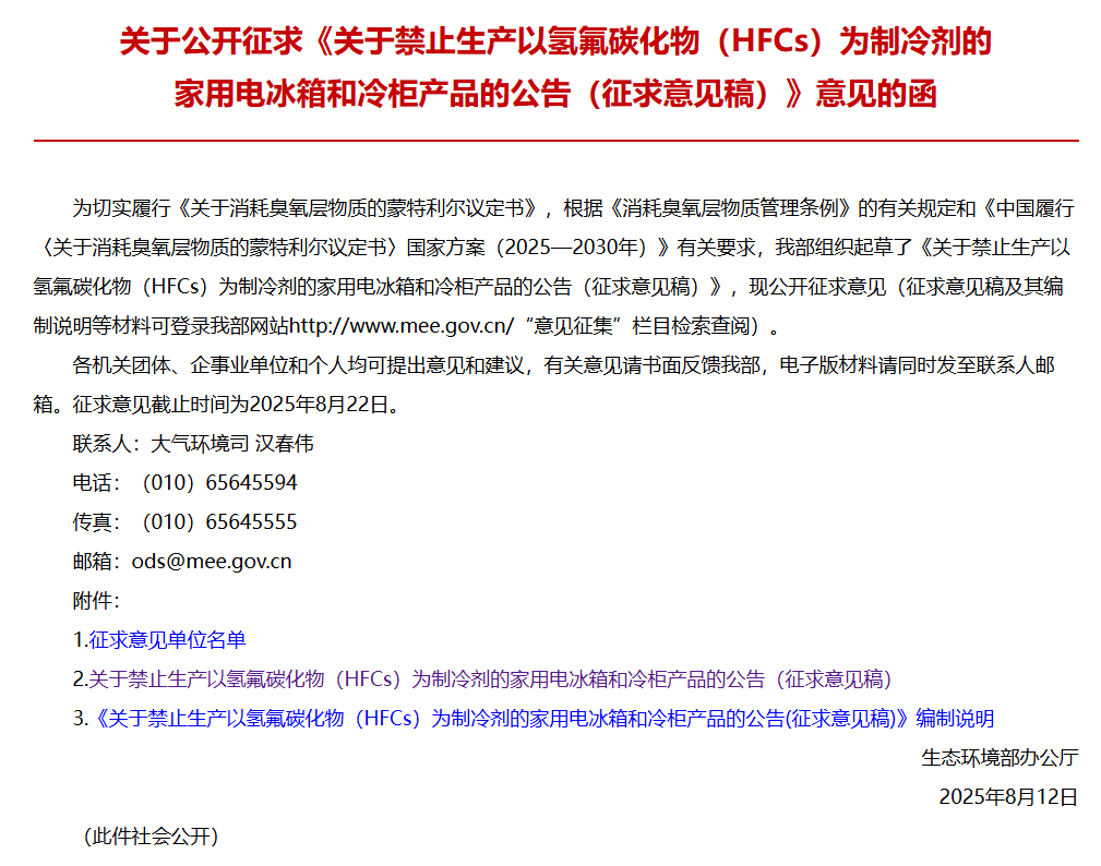 IT之家 8 月 15 日消息,生态环境部今日发布《关于禁止生产以氢氟碳化物(HFCs)为制冷剂的家用电冰箱和冷柜产品的公告(征求意见稿)》,公开征求意见。征求意见如下: